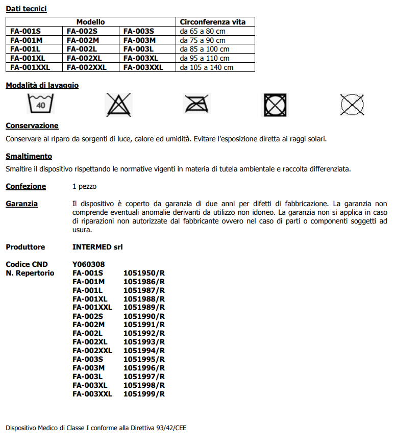  Il dispositivo medico deve essere impiegato a seguito di valutazione clinica effettuata da un medico specialista il quale, dopo la diagnosi, individuerà la misura e gli eventuali adattamenti nel rispetto delle caratteristiche morfologiche paziente. Tali adattamenti e la successiva applicazione della cintura addominale devono avvenire a cura di personale tecnico specializzato.