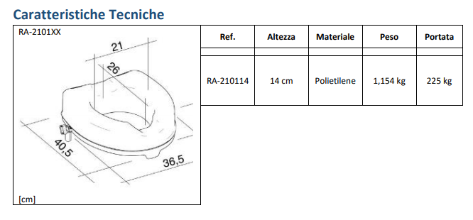 Alza WC anatomico con fissaggi laterali. Altezza 14 cm. Si fissa sul water tramite un meccanismo di bloccaggio consistente in due staffe laterali in plastica regolabili in larghezza. Adatto a tutti i tipi di water. Può essere sanificato in autoclave a 85° per un minuto.