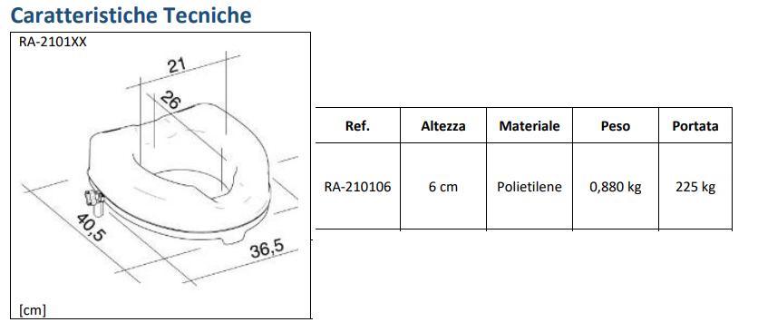 Alza WC anatomico con fissaggi laterali altezza. Altezza 6 cm. Si fissa sul water tramite un meccanismo di bloccaggio consistente in due staffe laterali in plastica regolabili in larghezza. Adatto a tutti i tipi di water. Può essere sanificato in autoclave a 85° per un minuto.