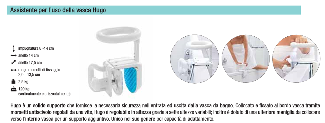 Hugo è un solido supporto che fornisce all’utente la necessaria sicurezza nell’entrata ed uscita dalla vasca da bagno. Collocato e fissato al bordo vasca tramite morsetti antiscivolo regolati da una vite, Hugo è regolabile in altezza grazie a sette altezze variabili; inoltre è dotato di una ulteriore maniglia da collocare verso l’interno vasca per un supporto aggiuntivo. Facilita l'ingresso in vasca da bagno. Ideato per anziani o utenti con limitata capacità degli arti inferiori, Hugo è unico nel suo genere per la capacità di adattamento alle esigenze dell’utente ed alle caratteristiche della vasca.
