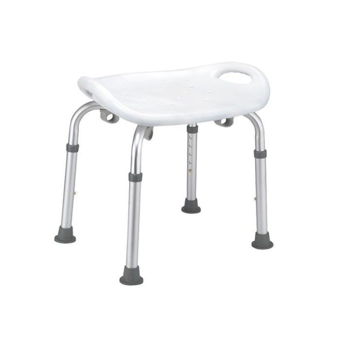 Sedile per doccia in alluminio regolabile in altezza. Seduta ergonomica in polietilene con fori per il deflusso dell’acqua. Puntali in gomma antiscivolo.