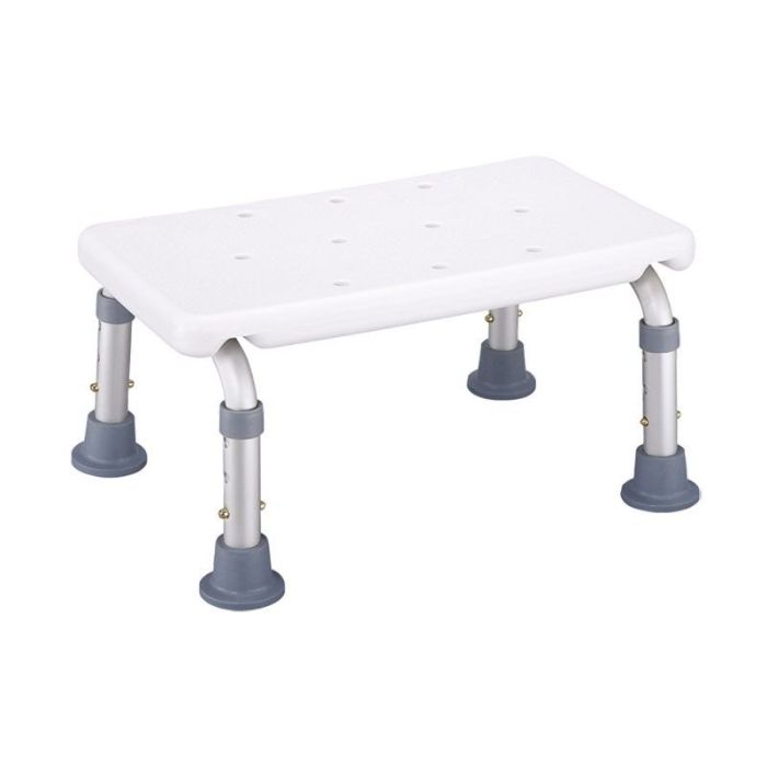 Predellino per vasca con struttura in alluminio anodizzato e piano d’appoggio in polietilene.