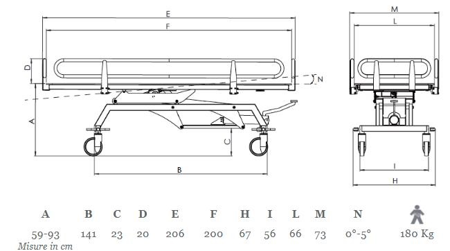 Barella doccia idraulica per il lavaggio ed il trasferimento di pazienti, elevabile idraulicamente da 59 a 93 cm, con piano di lavaggio inclinabile tramite molla a gas fino a 5° per un corretto drenaggio durante e dopo l'uso. Struttura in acciaio verniciato a polveri, con trattamento antiruggine di derivazione automotive per garantire affidabilità e durata nel tempo. Telo imbottito in PVC rinforzato con poliestere, privo di ftalati, sanificabile. Le ruote ad alto scorrimento, Ø 125 mm, sono dotate di freno a blocco totale. La larghezza contenuta della barella consente una facile movimentazione senza sforzi anche in spazi ristretti. Dotata di sponde ribaltabili di 180° per consentire un facile posizionamento del paziente sulla barella direttamente dal letto e viceversa