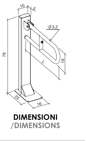 Barra di sostegno montata su colonna, in acciaio con finitura lucida oppure laccato a polvere epossidica, Ø3,2 cm, ribaltabile per ridurre l’ingombro.