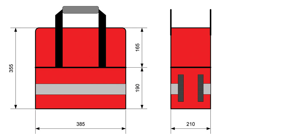 Trasportabile a mano o a tracolla. Completa di strisce anteriori e laterali in materiale riflettente e piedini di sicurezza antiscivolo.