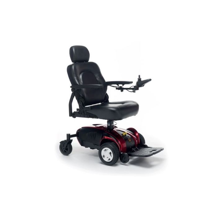 Carrozzina elettrica da interni con trazione anteriore. Il sedile ha un'altezza variabile e lo schienale è regolabile fino a 105°. Dotata di pedana ribaltabile.