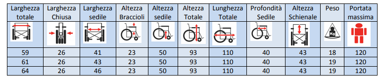 Carrozzina pieghevole standard ad auto spinta, struttura in lega di metallo (acciaio – cromo molibdeno).