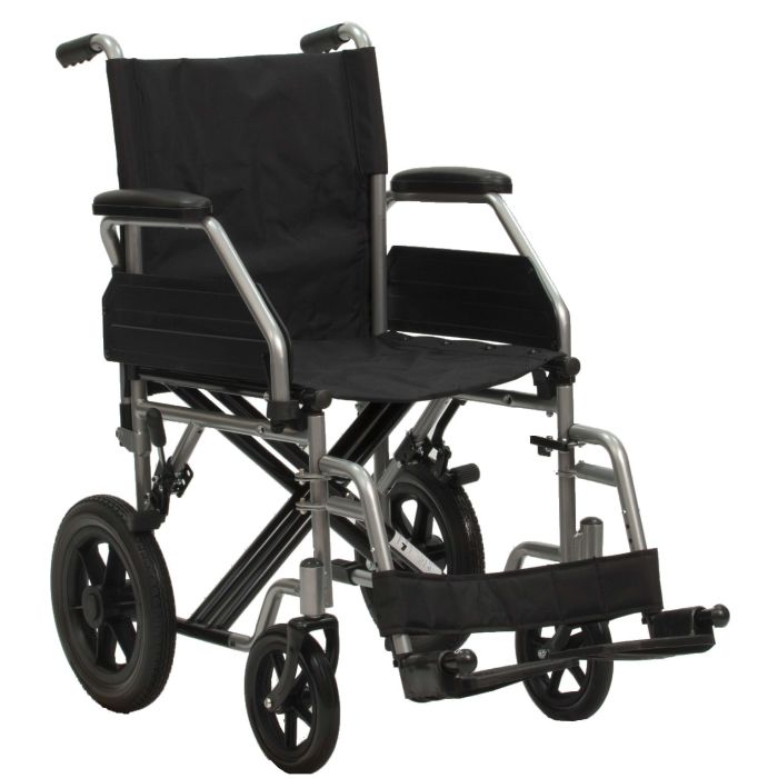 La carrozzina Basic Transito a doppia crociera è un dispositivo pieghevole progettato per persone con difficoltà di deambulazione. Questo modello, dotato di ruote posteriori autospinta, permette all'utente di muoversi autonomamente utilizzando il corrimano.