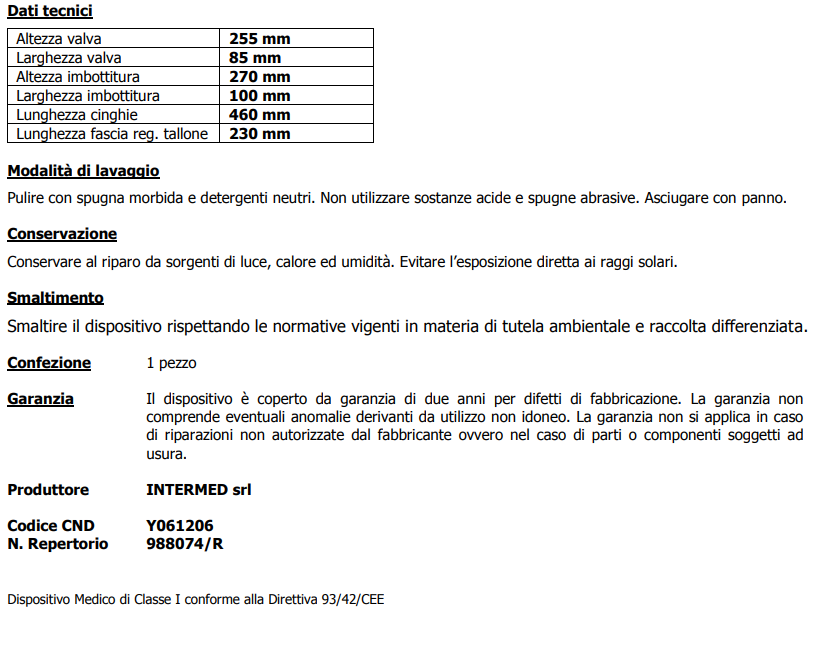 Il dispositivo medico deve essere impiegato a seguito di valutazione clinica effettuata da un medico specialista il quale, dopo la diagnosi, individuerà la misura e gli eventuali adattamenti nel rispetto delle caratteristiche morfologiche dell’arto del paziente. Tali adattamenti e la successiva applicazione della cavigliera devono avvenire a cura di personale tecnico specializzato.