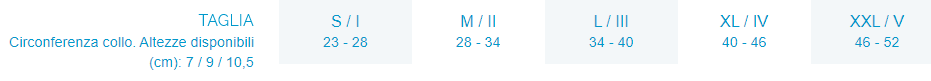Supporto morbido in polipropilene a bassa densità, reso più rigido da un supporto in plastica supplementare amovibile, dotato di chiusura a velcro per regolare la circonferenza del collo. Riduce la mobilità del collo con effetto antalgico e di prevenzione del dolore. Si indossa a contatto della pelle perché rivestito di tessuto di cotone non allergico e traspirante.