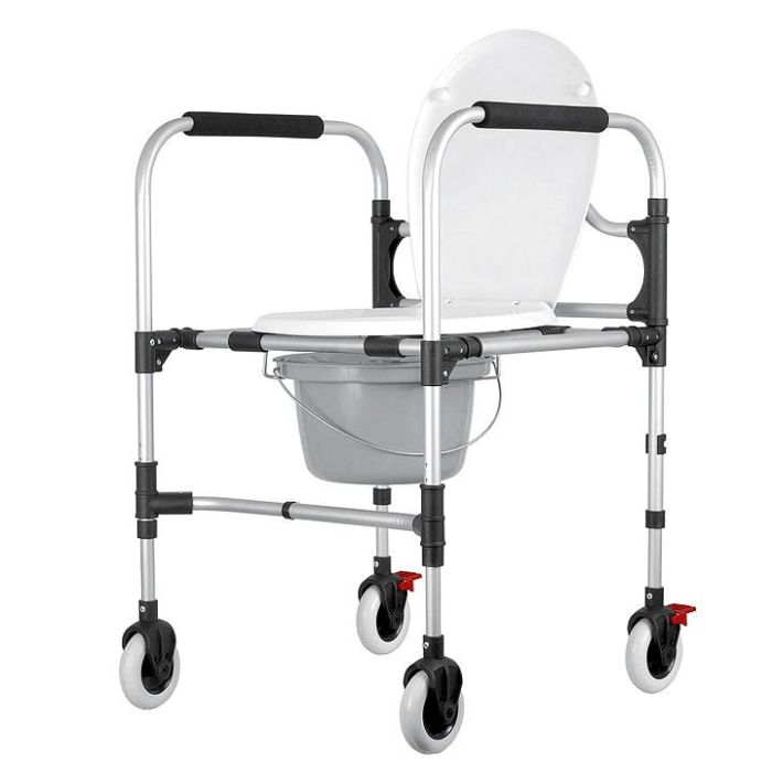 Sedia comodaper il wc dotata di quattro ruote e due freni di stazionamento, è ripiegabile con un semplice movimento e può essere facilmente riposta quando non utilizzata.