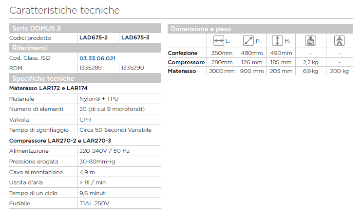 Il compressore, molto silenzioso, compatto e leggero, è facile da usare, non necessita di lubrificazione e richiede pochissima manutenzione, è dotato di un allarme visivo e sonoro per la bassa pressione e di un filtro aria intercambiabile. Il DOMUS 3 include la funzione STATIC che blocca il sistema alternato e lo rende di fatto un normale materasso. Il materasso viene collegato al compressore tramite connettori veloci dotati di chiusura, utilizzabile in caso di trasporto del paziente. Due ganci permettono di appendere il compressore all'estremità del letto.