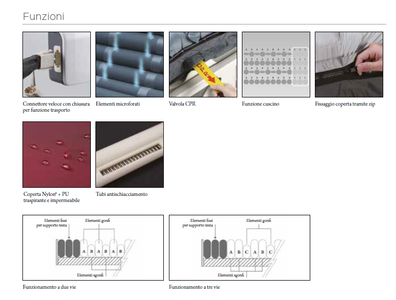 Il materasso viene fornito con coperta in Nylon/PU traspirante ed impermeabile fissata per mezzo zip. Il materasso può essere fissato al letto tramite cinghie in dotazione ed è dotato di occhielli passacavo. La valvola CPR (Cardio Pulmonary Resuscitation) permette uno sgonfiaggio rapido del materasso per interventi di rianimazione urgenti.