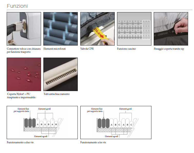 I 9 elementi centrali sono microforati garantendo una ventilazione forzata (LOW AIR LOSS). Il materasso viene fornito con coperta in Nylon/PU traspirante ed impermeabile fissata per mezzo zip. Il materasso può essere fissato al letto tramite cinghie in dotazione ed è dotato di occhielli passacavo.