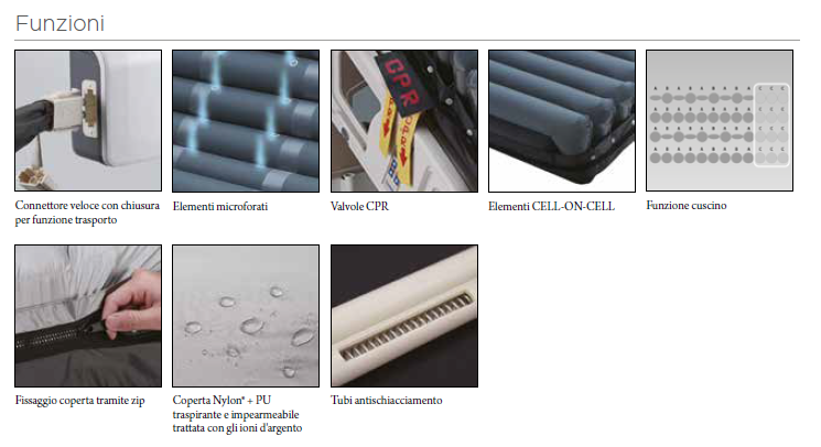 Il materasso viene fornito con coperta in Nylon/PU traspirante ed impermeabile con effetto antimicrobico grazie al trattamento agli Ioni di Argento, fissata per mezzo zip. Il materasso può essere fissato al letto tramite cinghie in dotazione ed è dotato di occhielli passacavo. La valvola CPR (Cardio Pulmonary Resuscitation) permette uno sgonfiaggio rapido del materasso per interventi di rianimazione urgenti. Il compressore, molto silenzioso, compatto e leggero, è facile da usare, non necessita di lubrificazione e richiede pochissima manutenzione, è dotato di un allarme visivo e sonoro per bassa pressione, mancanza di alimentazione e manutenzione ed è dotato di un filtro aria intercambiabile.