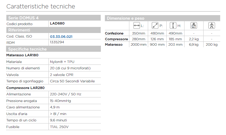 Il DOMUS 4 è consigliato per la prevenzione ed il trattamento delle piaghe da decubito fino al IV stadio, in terapie a lungo termine e terapie domiciliari. È composto da un materasso alto 20,3cm a 20 elementi intercambiabili in Nylon/TPU impermeabili e traspiranti e da un compressore a controllo digitale.