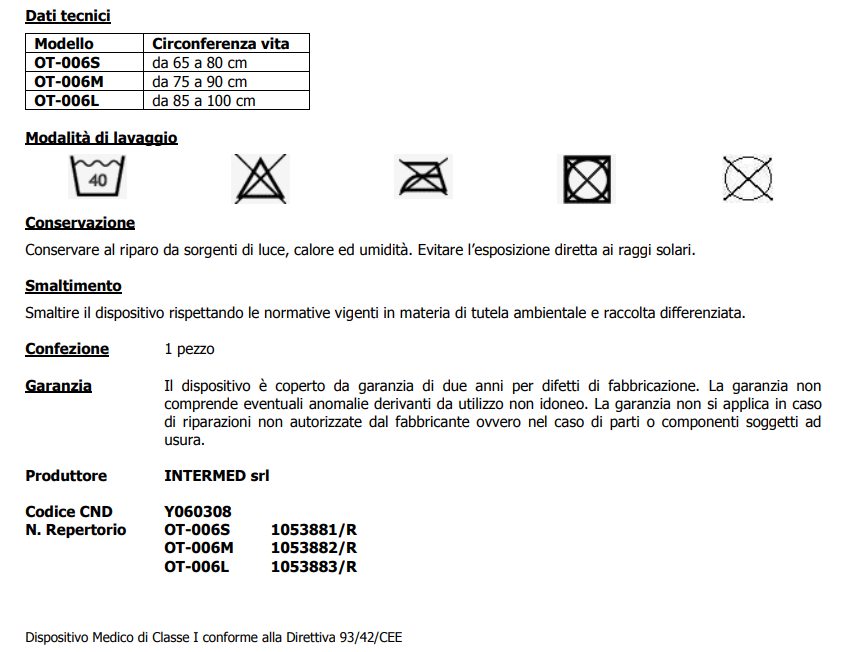 Si raccomanda di verificare con regolarità l’integrità del corsetto e la tenuta dei sistemi di chiusura. Su indicazione ed a parere del medico specialista, effettuare controlli periodici per la verifica dell’efficacia funzionale del corsetto. Si sconsiglia, per motivi di igiene ed efficacia terapeutica, il riutilizzo del corsetto su altri pazienti.