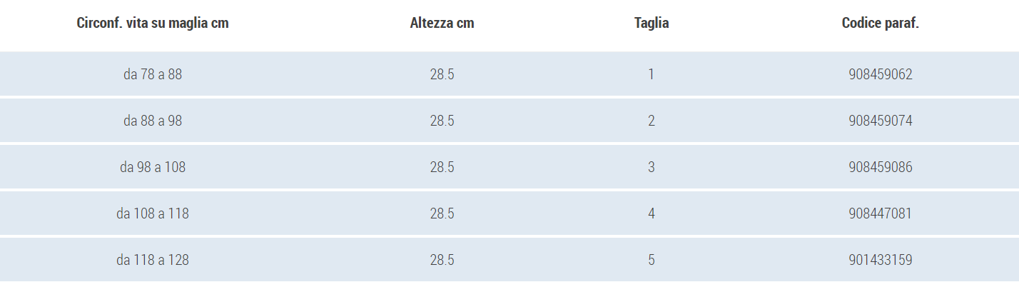 indossare sopra un indumento leggero, l'etichetta della taglia deve essere posizionata in alto ed all'interno. É necessario un buon centraggio: le piccole stecche laterali saranno posizionate simmetricamente. Le stecche posteriori mediane si troveranno lateralmente alla colonna vertebrale. Per assicurare una contenzione omogenea, esercitare una trazione simmetrica. La cintura é fornita di steccaggio forte. All'interno della confezione sono inserite anche le stecche leggere. L'estrazione delle stecche necessaria per l'inserimento dello steccaggio morbido o per lavare la cintura, verrà fatto attraverso l'apertura laterale prevista a tale scopo.
