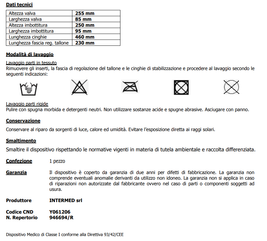 Il dispositivo medico deve essere impiegato a seguito di valutazione clinica effettuata da un medico specialista il quale, dopo la diagnosi, individuerà la misura e gli eventuali adattamenti nel rispetto delle caratteristiche morfologiche dell’arto del paziente. Tali adattamenti e la successiva applicazione della cavigliera devono avvenire a cura di personale tecnico specializzato.
