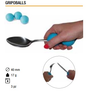 La forma e le dimensioni delle Gripoballs consentono una migliore presa nel palmo della mano di strumenti piccoli e sottili, infatti permettono di non piegare eccessivamente le dita. Tascabili e facili da portare con sé, queste ingrossa impugnature sono applicate a posate, utensili e strumenti di scrittura tramite i due fori centrali.