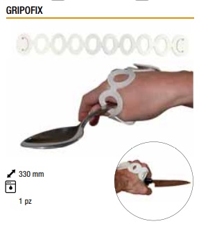 Nel KIT è incluso Gripofix: fascia metacarpale universale che assicura la presa di posate, utensili, strumenti di scrittura anche con palmo della mano aperto, senza pertanto il completo utilizzo delle dita. Gripofix è utilizzabile da solo o in combinazione con le Gripoballs.