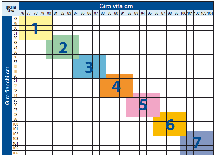 • Fascia elastica di sostegno molto ampia, con andamento fisiologico a salire sino alla cresta iliaca per poi appoggiarsi sulla zona lombodorsale. Per evitare che si arrotoli nelle parti posteriori della fascia sono inserite 4 piccole stecche morbide.