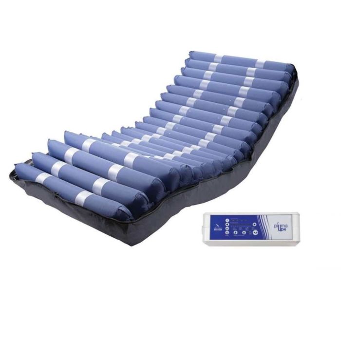 Indicato per la prevenzione delle piaghe da decubito fino al IV STADIO.I primi quattro elementi a funzionamento statico con funzione cuscino per la testa; la restante parte è divisa in 2 sezioni a funzionamento alternato a 2 vie; completo di coperta imbottita in Nylon/PU biocompatibile, impermeabile, traspirante, verificata secondo le norme europee di reazione al fuoco e dotata di zip su tutti e quattro i lati per una facile rimozione e pulizia. Fissaggio del materasso al letto tramite cinghie in dotazione e dotato di occhielli passacavo. L’altezza degli elementi permette di utilizzare il materasso senza l’utilizzo di un materasso aggiuntivo. Gli elementi sono realizzati con la tecnica CELL-ON-CELL che divide la sezione in due moduli singoli dei quali quello inferiore rimane costantemente gonfio in modo da evitare un eccessivo effetto BOTTOM-OUT (sprofondamento), e garantire una sicurezza in caso di mancanza di corrente. Il compressore digitale è dotato di regolazione di pressione e di durata del ciclo, allarme visivo e sonoro per la bassa pressione e filtro aria intercambiabile. La funzione STATIC blocca il sistema alternato e lo rende di fatto un normale materasso. Connessione materasso/compressore tramite connettori veloci con chiusura, utilizzabile in caso di trasporto del paziente.