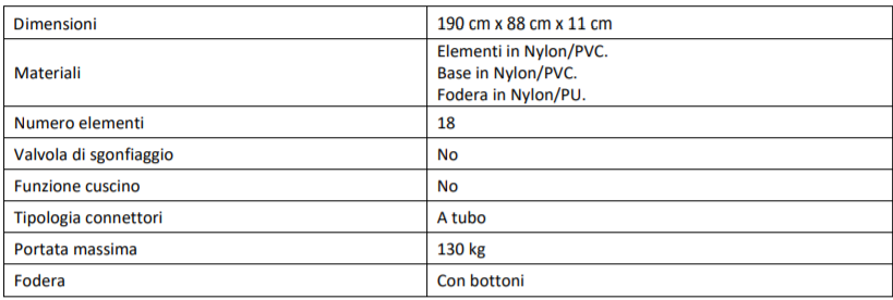 • Composto da un sovramaterasso a 18 elementi intercambiabili in Nylon/PVC con tubi di connessione a 2 vie, una base in Nylon/PVC, una fodera in Nylon/PU, un compressore con manopola di regolazione della pressione.