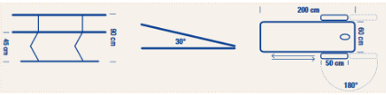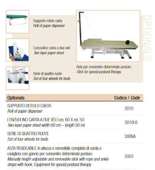 Lettino per osteopatia e altri trattamenti. Lettino a tre segmenti regolabile elettricamente in altezza da cm. 45 a cm. 90 mediante comando a pedale. Può assumere la posizione TRENDELENBURG mediante pistone a gas. Foro per la respirazione completo di tappo. Gli appoggia braccia scorrono su tutta la lunghezza del lettino e ruotano di 180°. Il piano è imbottito e rivestito in similpelle lavabile, trattamento ntibatterico/antiacaro ed ignifuga classe 1IM. Portata Max kg. 150 uniformemente distribui