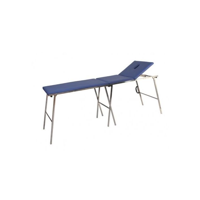 Lettino da visita con struttura in acciaio cromato. Poggiatesta inclinabile fino a 60° e dotato di foro per la respirazione. Rivestimento in ecopelle ignifugo.