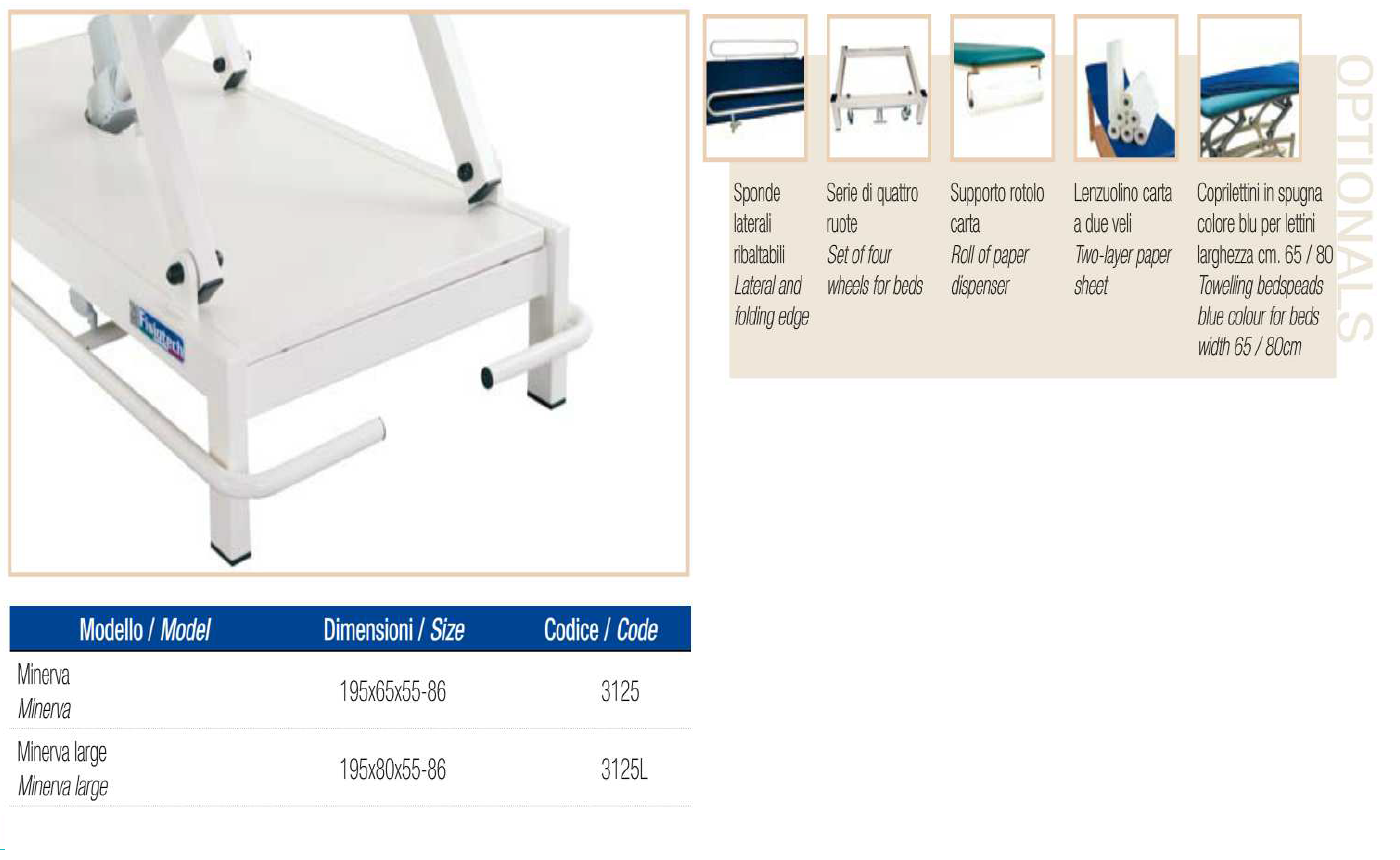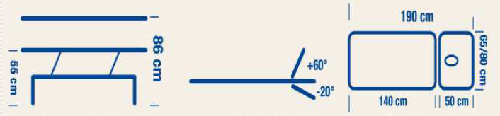 Lettino a quattro segmenti regolabile elettricamente in altezza da cm. 55 a cm. 86 mediante pedaliera circolare. Testata regolabile da +60° a -20° mediante pistone a gas con appoggia braccia regolabili. Foro per la respirazione completo di tappo. Il piano è imbottito e rivestito in similpelle lavabile, ignifuga classe 1IM. Portata max kg.200 uniformemente distribuiti. Disponibile in due diverse misure di larghezza.
