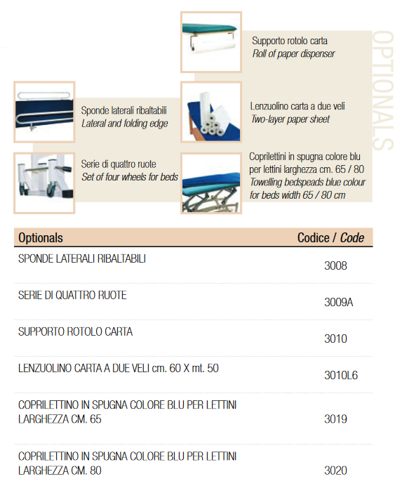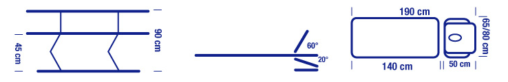 Lettino a quattro segmenti regolabile elettricamente in altezza da cm. 45 a cm. 90 mediante comando a pedale. Testata regolabile da +60° a -20° mediante pistone a gas con appoggia braccia regolabili e foro per la respirazione completo di tappo. Il piano è imbottito e rivestito in similpelle lavabile, antibatterico/antiacaro ed ignifuga classe 1IM. Portata max kg. 150 uniformemente distribuiti.
