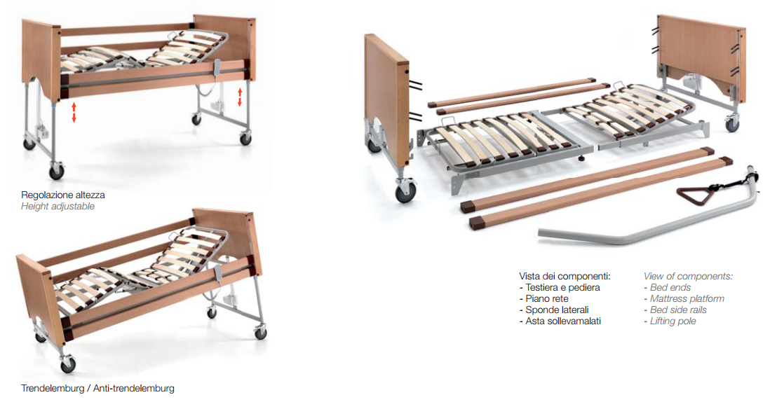 - Struttura portante perimetrale esterna costruita in profili di acciaio a sezione rettangolare. Telaio sezioni mobili realizzato in tubo di acciaio a sezione ovale. Telo rete in doghe di legno, guide reggimaterasso. Dotato di due supporti per asta sollevamalato e asta porta flebo. Piano rete a 4 sezioni. Sezione alzatesta e sezione gambe regolabili a mezzo di due motori elettrici 24V DC e pulsantiera con chiave per blocco funzioni. Sezione piedi con regolazione a cremagliera. Sezione bacino fissa.
