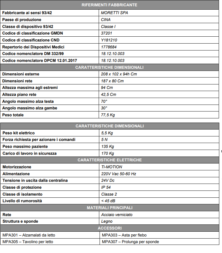 Testiera, pediera e sponde in legno. Poggiaschiena e poggia gambe regolabili in altezza tramite attuatori elettrici.