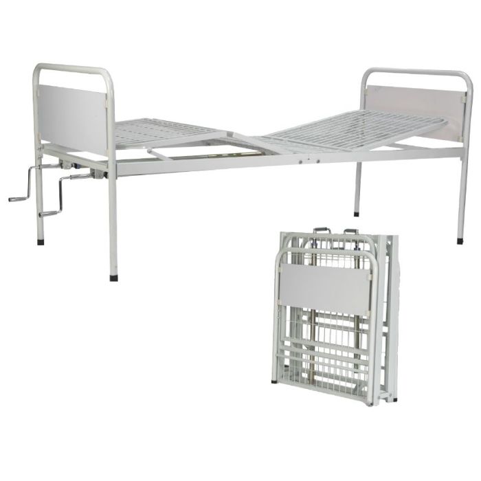 Letto ortopedico da degenza a due manovelle, quattro sezioni e tre snodi che permettono di regolare indipendentemente l’inclinazione dello schienale e del poggiagambe. Il supporto materasso è smontabile. Ripiegabile in due parti per facilitarne il trasporto.
