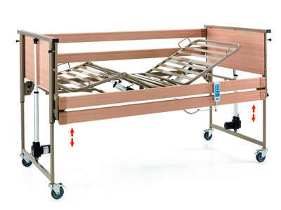 Sponde A scorrimento verticale a due montanti in alluminio. Finitura faggio naturale fissate alle testate a mezzo dispositivi di scorrimento. Sblocco sponde tramite tasto sulla testiera. Spalle Testiera e pediera smontabili in tubo di acciaio verniciato, con pannelli asportabili fi nitura legno. Gambe Integrate nelle spalliere complete di 4 ruote girevoli Ø 100 mm. dotate ognuna di freno indipendente. |