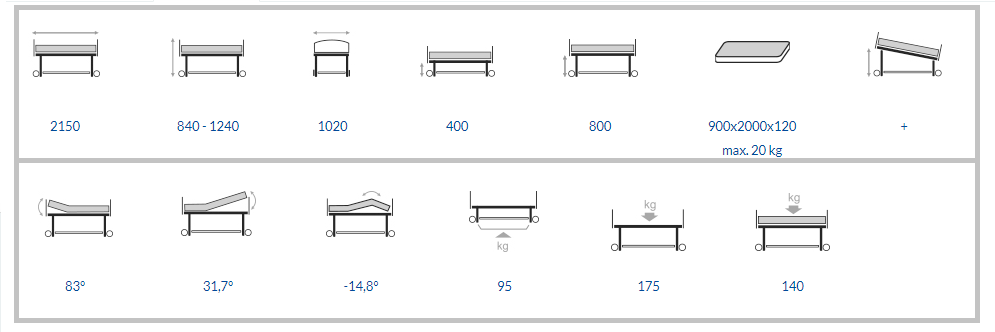 Trendelenburg Movimento Trendelenburg fino a 12° e anti-Trendelenburg fino a 12° tramite comando sulla stessa pulsantiera, grazie alla movimentazione indipendente dei due spintori elettrici integrati nelle testate. |