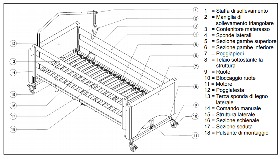 Letto elettrico dotato di motori posizionati sui pannelli in legno parte testa e parte piedi. Questo permette di lasciare completamente libero lo spazio sotto il letto. Il kit di trasporto ne rende facile lo spostamento per poterlo trasportare. Per tutte le misure, consultare il catalogo allegato.