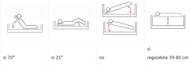 Dispone di una regolazione elettrica dell'inclinazione della parte schiena per alzare ed abbassare il disabile, parte gambe tramite la semplice pressione di un pulsante.