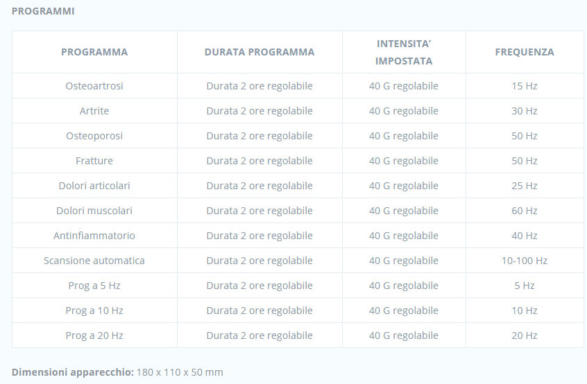 MAG 700 è dotato di 7 programmi preimpostati identificati dal nome delle patologie più comuni e 3 programmi identificati dalla frequenza di lavoro (da 5 a 20 Hertz) e un programma Autoscan a variazione continua di frequenza per il trattamento di tessuti molli e tessuti duri nella stessa seduta di terapia. MAG 700 permette di impostare liberamente l’intensità del campo magnetico per tutti i programmi, con valori massimi fino 70 Gauss.