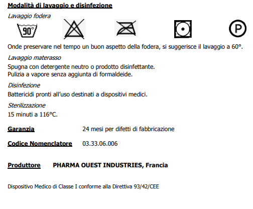 Indicazioni Materasso studiato per la prevenzione delle piaghe da decubito per pazienti allettati a rischio medio e alto.