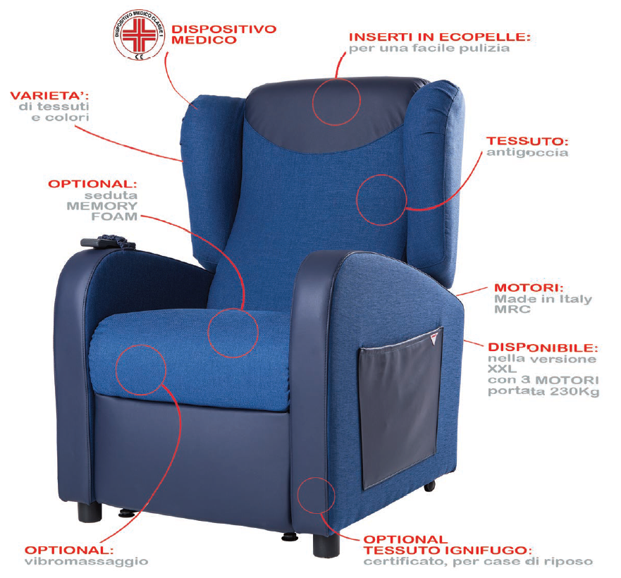 La poltrona BETTY Italia 2 motori totalmente realizzata in Italia. Disponibile nella sola versione due motori, per esaltare al massimo l’indipendenza dell’inclinazione dello schienale e l’elevazione del poggia gambe più il movimento lift (messa in piedi).