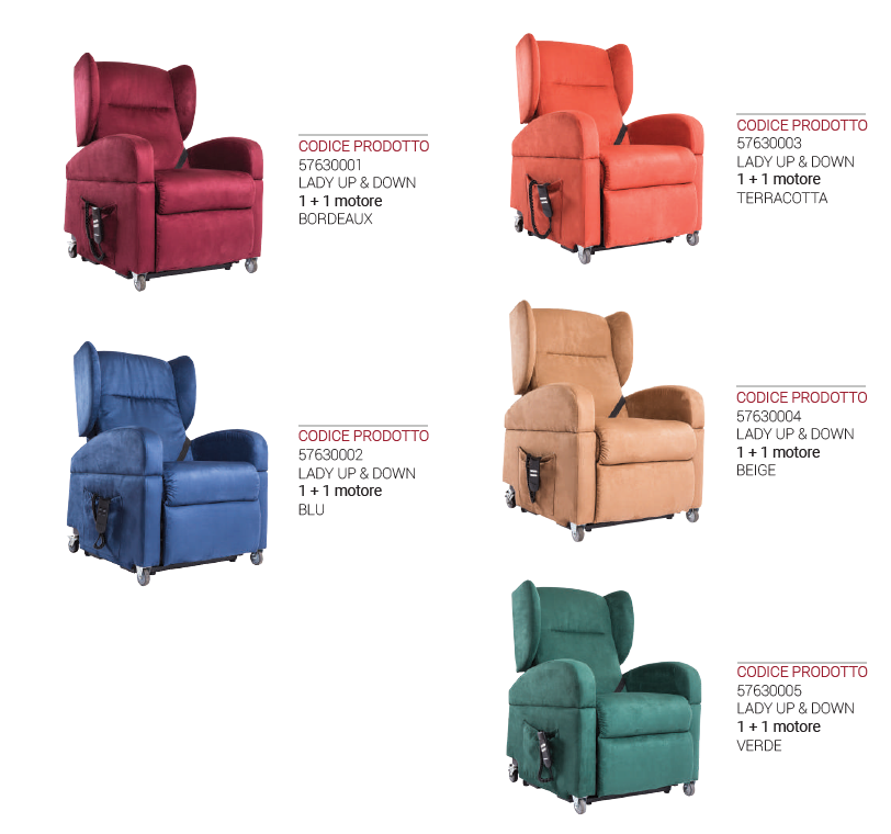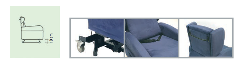 Questo modello di poltrona è pensato per agevolare e rendere meno gravosa la gestione di utenti con patologie particolarmente invalidanti sia nell’ambito domiciliare che nelle strutture. I braccioli e le alett e laterali dello schienale removibili sono di serie; questa caratteristica unica permette e facilita i trasferimenti laterali dell’utente in sicurezza da parte degli assistenti , non opponendo nessun ostacolo durante questa delicata operazione. Questo modello presenta di serie 4 ruote (2 piroett anti posteriori con freno e due fi sse anteriori) ed un maniglione di spinta posteriore, per facilitare lo spostamento della poltrona anche con l’uti lizzatore seduto. Per esaltare al massimo l’indipendenza della regolazione dell’inclinazione dello schienale, dall’elevazione del poggia gambe, prevede nello standard il movimento ‘lift ’ (o di alzata), che consente di ott enere la posizione verti cale, oltre alla funzione Stand Up, e Letto.