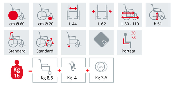Carrozzina per disabili leggera con telaio in alluminio ed acciaio speciale.