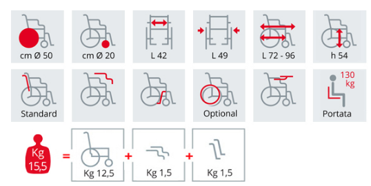 - Braccioli ribaltabili o estraibili con sistema di sbloccaggio rapido e arresto di sicurezza.