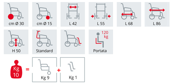 Carrozzina per disabili super leggera con telaio in alluminio e materiali speciali.