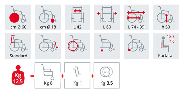 Carrozzina per disabili super leggera con telaio in alluminio e materiali speciali.