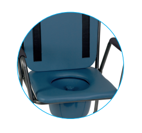 Sedia comoda con struttura in acciaio verniciato. Sedile con apertura centrale per l’igiene e coprisedile. Corredata di secchio in plastica con coperchio. Rivestimento in sky, facilmente lavabile.