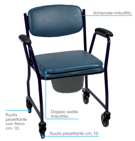 Sedia comoda wc con struttura in acciaio verniciato, sedile e schienale imbottiti. Sedile con apertura centrale per l’igiene e coprisedile imbottito. Dotata di quattro ruote piroettanti.