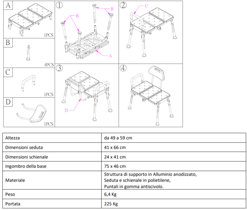 - Grazie alla larghezza della seduta, che permette di scivolare sulla stessa stando in posizione seduta ed alla regolazione in altezza, permette di entrare facilmente anche nella vasca.